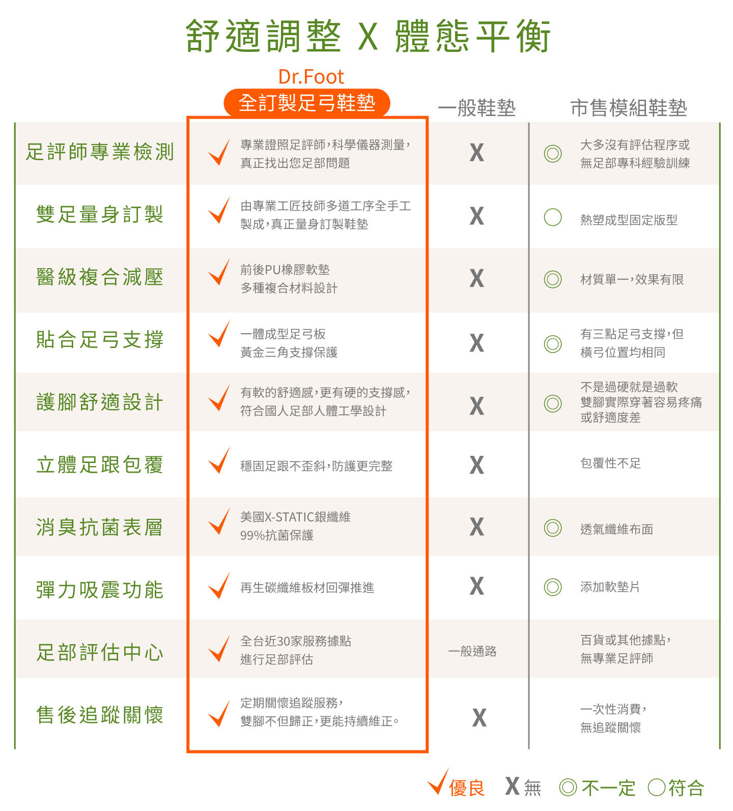 Dr.Foot擁有超過二十多年的專業鞋墊製作經驗和足部健康照護專業知識,針對不同足部問題解決,提供穩定步態,支撐、減輕壓力、均勻分散壓力,不但讓你的足部歸正,更能持續維正!