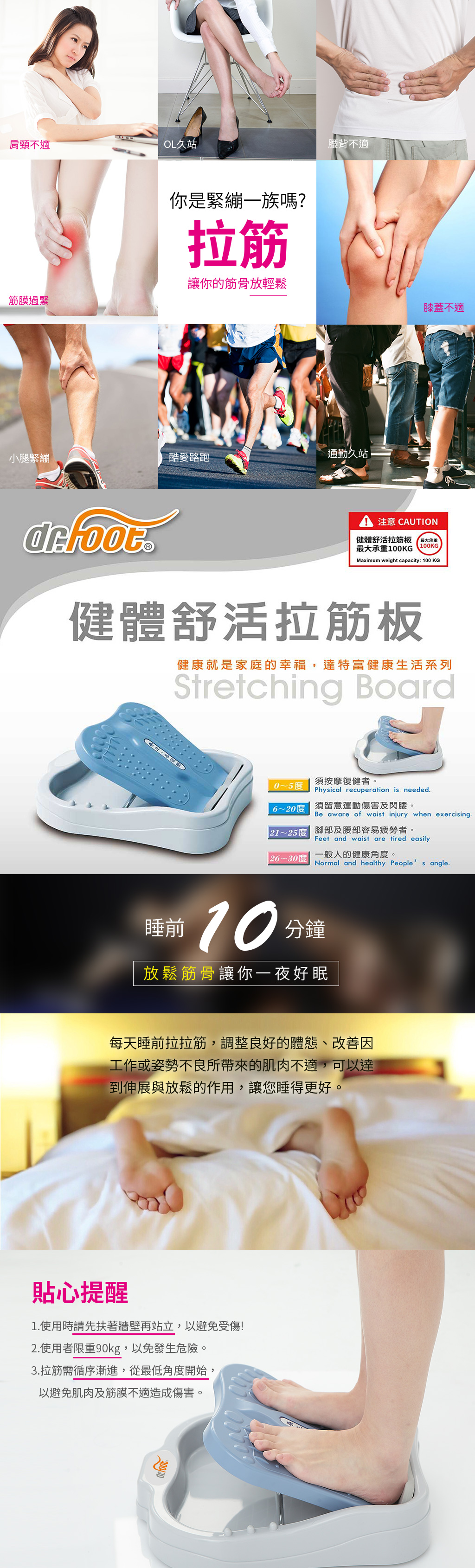 可用於拉小腿筋,藉由使用產品拉筋或伸展可增加肌肉彈性,並可輔以運動前或後的暖身或是緩和動作,養成拉筋習慣可預防肌肉拉傷,也能提昇運動效果。 提醒您! 拉筋需循序漸進,從最低角度開始,以避免肌肉及筋膜不適造成傷害。