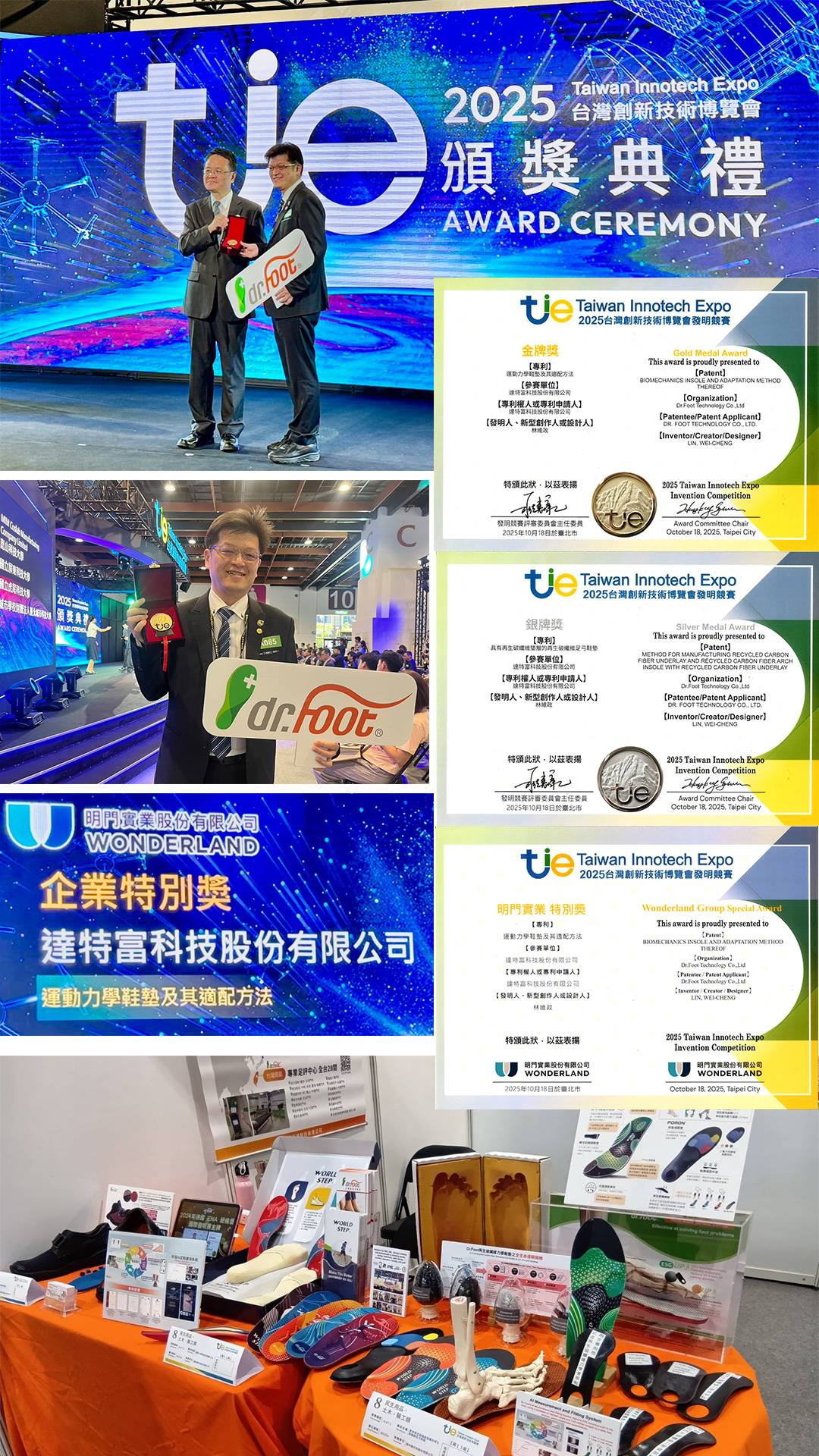 Dr.Foot 再次站上頒獎舞台!在2025 台灣創新技術博覽會發明競賽(TIE) 中,我們的【運動力學鞋墊及其適配方法】榮獲金牌與企業特別獎,【再生碳纖維足弓鞋墊】也拿下 銀牌殊榮!