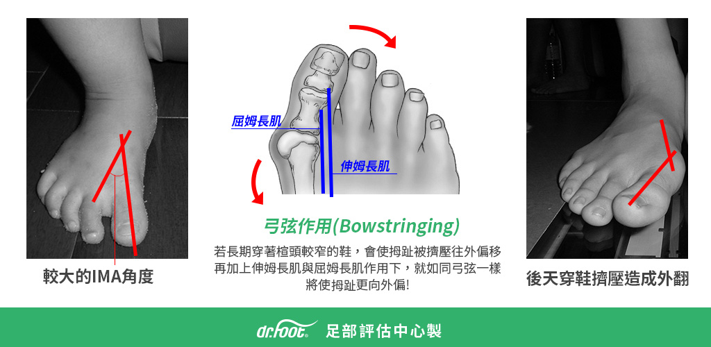 1、 較大的IMA角度:如果天生第一蹠骨就屬於比較內偏的人,後天再因為穿著楦頭較窄的鞋子造成壓迫,歪斜的趾骨與蹠骨形成弓的形狀,再加上腳趾肌肉像是弓上的弦緊繃的拉扯,就容易形成弓弦作用,而造成拇趾往外偏移外翻。