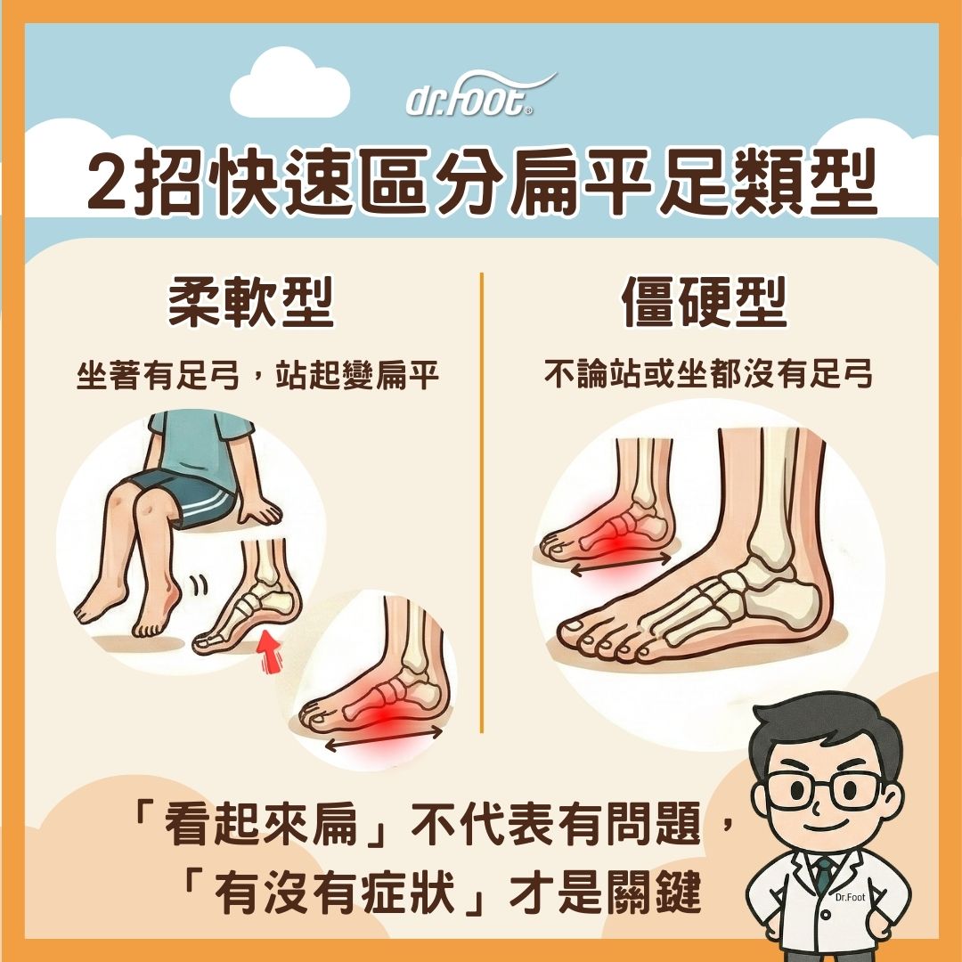 📚 在臨床判讀上,兒童扁平足通常有兩類:功能型(flexible) 和 結構型(rigid),兩者後續的判斷與處理方式會不一樣: